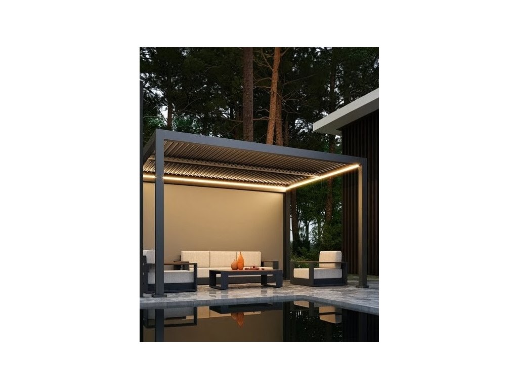 Luxusná bioklimatická pergola DELUX s integrovaným LED osvetlením a elektrickým ovládaním. Doprajte si maximálny komfort s dvojitými hliníkovými lamelami pre vyššiu odolnosť a diaľkovým ovládačom pre jednoduchú reguláciu tieňa